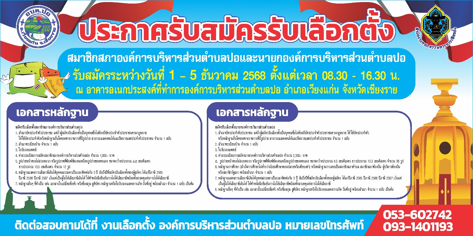 องค์การบริหารส่วนตำบลปอ ประกาศรับสมัครรับเลือกตั้งสมาชิกสภาองค์การบริหารส่วนตำบลและนายกองค์การบริหารส่วนตำบลปอ ระหว่างวันที่ 1 - 5 ธันวาคม 2568 ตั้งแต่เวลา 08.30 - 16.30 น. ณ อาคารอเนกประสงค์ที่ทำการองค์การบริหารส่วนตำบลปอ (อาคารโดม) สอบถามรายละเอียดได้ที่สำนักปลัด 053-602742, 084-0479554, 093-1401193